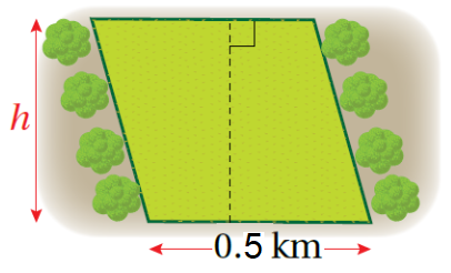 لدى مزارع قطعةُ أرض على شكل مُتوازي أضلاع مساحته 0.45Km وطول قاعدته 0.5Km إذا بنى المُزارعُ سورًا على طول الخطّ المُوضّح في الرّسم، فما طول هذا السّور بالأمتار.