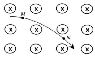 21- يدخل إلكترون مجال مغناطيسي منتظم في اتجاه عمودي على المجال كما في الشكل المجاور , القوى المؤثرة عند النقطتين على مسار الإلكترون هما على الترتيب .