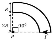 25- الشكل يمثل سلك ملفوف على شكل جزء من حلقة دائرية اعتمادا على الشكل والبيانات المثبتة عليه , إن مقدار المجال المغناطيسي عند النقطة يساوي