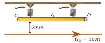 26- سلك مستقيم كتلة وحدة الأطوال منه معلق رأسيا في الفراغ بواسطة نابضين أسفلهما سلك يبعد ويحمل تيار نحو الشرق فإن مقدار التيار واتجاهه الذي يجب أن يمر في السلك ليجعل مقدار الشد في النابضين يساوي صفرا هو :