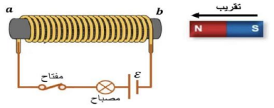 28- يمثل الشكل المجاور دارة كهربائية عند تقريب مغناطيس منها فإن (إضاءة المصباح ونوع القطب b) على الترتيب