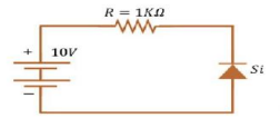 35- في الشكل المجاور الثنائي مصنوع من مادة السيليكون والمقاومة الداخلية لمصدر فرق الجهد مهملة ان (فرق الجهد بين طرفي الثنائي والتيار المار في المقاومة ) على الترتيب () تساوي