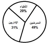 39- يمثل القطاع الدائري الاتي نسبة الموظفين في إحدى المستشفيات، حيث يحوي المستشفى على 600 موظف، إذا انتقل خمسة ممرضين إلى وظيفة إداري، فإن عدد الاداريين يساوي