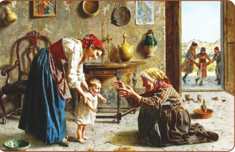 توحي اللوحة بالعديد من المعاني العميقة التي تتجاوز مجرد تصوير لحظة عائلية. إنها تجسد دور الأجيال في دعم بعضها البعض، حيث تمثل الأم الحاضر الذي يرعى ويقود، والجدة تمثل الماضي والحكمة التي تقدم الدعم والتشجيع. الطفل يمثل المستقبل، بكل ما يحمله من آمال وتحديات. هذه اللحظة، "الخطوة الأولى"، ليست مجرد حركة جسدية، بل هي رمز للانتقال من مرحلة الاعتماد الكامل إلى بداية الاستقلالية، وهي خطوة محفوفة بالخوف والأمل في آن واحد.