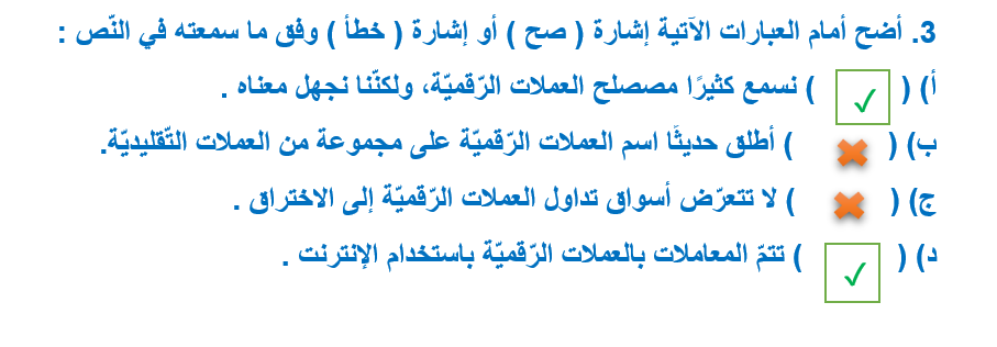 3. أضح أمام العبارات الآتية إشارة ( صح ) أو إشارة ( خطأ ) وفق ما سمعته في النّص :