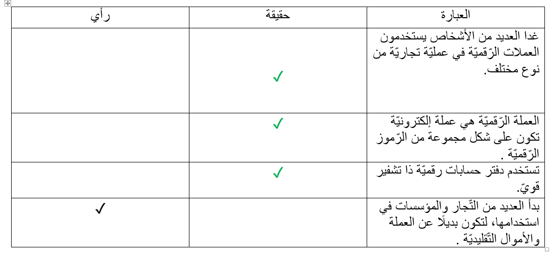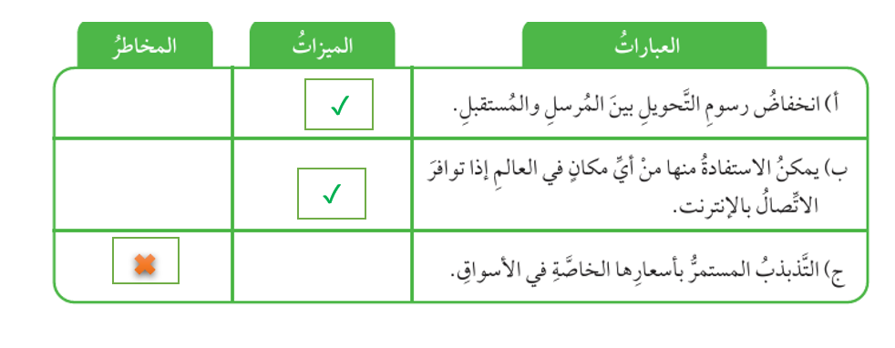 2) تقع العملات الرّقميّة وتداولها بين قطبين اثنين متنافرين : الميّزات والمخاطِر .أحدّد دلالة العبارات واضعًا إشارة ( صح ) إزاء العبارة مستعينًا بالجدول الآتي :