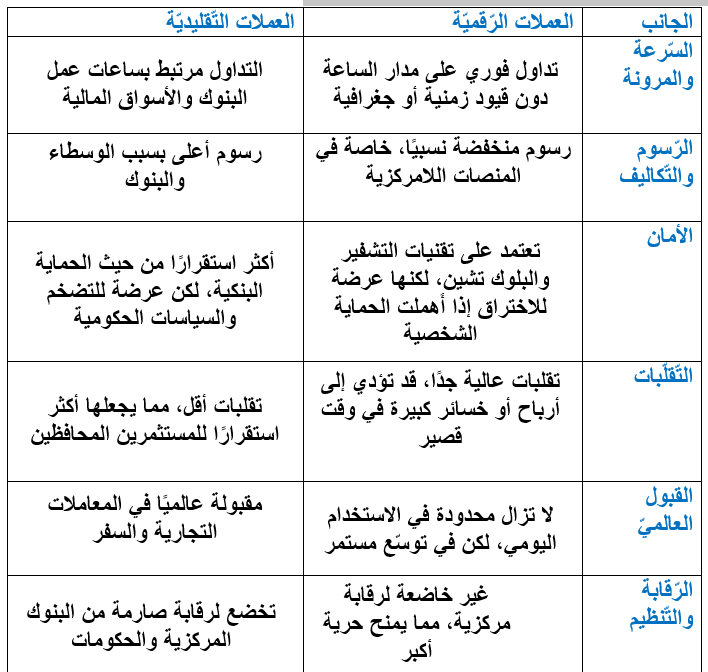 3. أعقد موازنة بين ميزات التّداول بالعملات الرقمية والتّداول بالعملات التّقليديّة ، وأبيّن سبب ميلي إلى التّداول أو الاستثمار بإحدى العملتين .