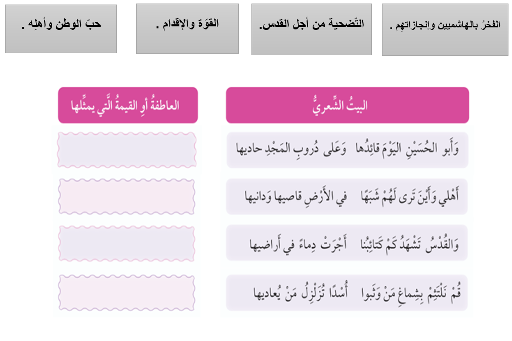 6) ظهرت عاطفة الشّاعِر الوطنيّة ظهورًا جليًّا في قصيدته ، أربِط كل بيت من الأبيات الشّعريّة الآتيّة بالعاطفة أو القيمة الّتي تمثّلها ممّا في الصّناديق :
