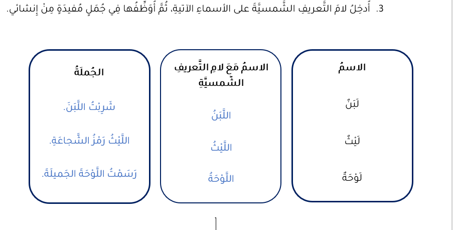 أُدخِلُ لامَ التَّعريفِ الشَّمسيَّةَ على الأسماءِ الآتيةِ، ثُمَّ أُوَظِّفُها فِي جُمَلٍ مُفيدَةٍ مِنْ إِنشائي.