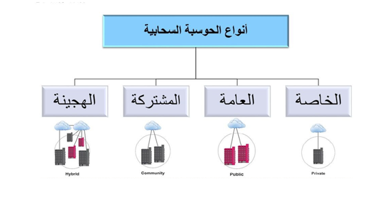 تختلف الحوسبة السحابية باختلاف طبيعة عملها وآلية إستخدامها، حيث تصنف حسب هذا المفهوم الى أربعة انواع رئيسية كما في الشكل التالي: