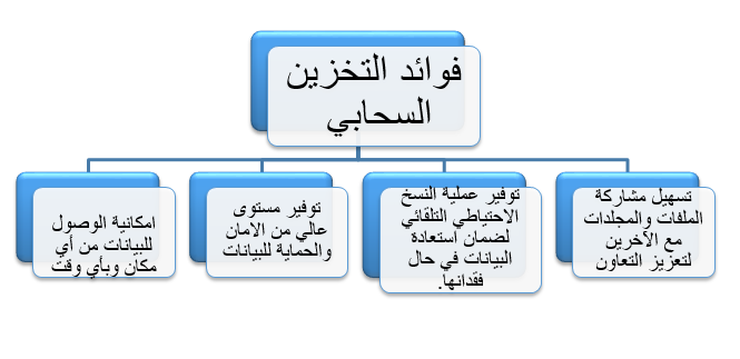 التخزين: يشمل انظمة التخزين السحابي لحفظ الملفات والبيانات والتطبيقات ضمن الخدمات السحابية لضمان الوصول إليها.