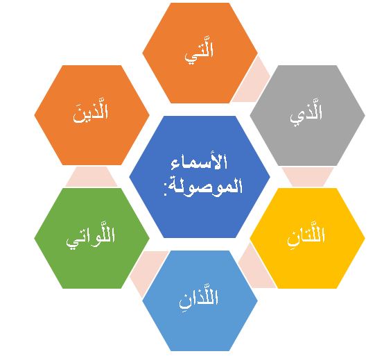 الأسماء الموصولة : الَّتي، الَّذي، اللَّتانِ، اللَّذانِ، الَّذينَ، اللَّواتي.