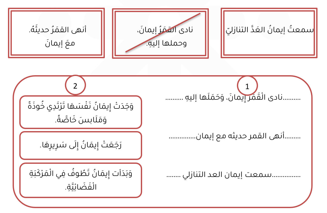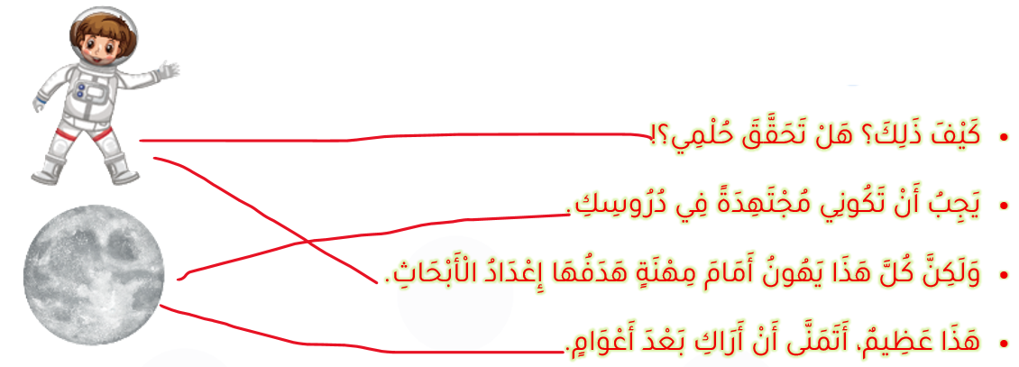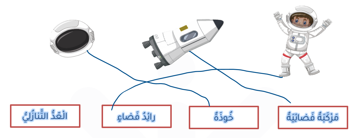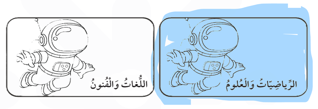 أُحَدِّدُ الْمَوَادَّ الدِّرَاسِيَّةَ الَّتِي تَحْتَاجُ إِيمَانُ إِلَى دِرَاسَتِهَا لِتُصْبِحَ رَائِدَةَ فَضَاءٍ، وَأُلَوِّنُهَا.