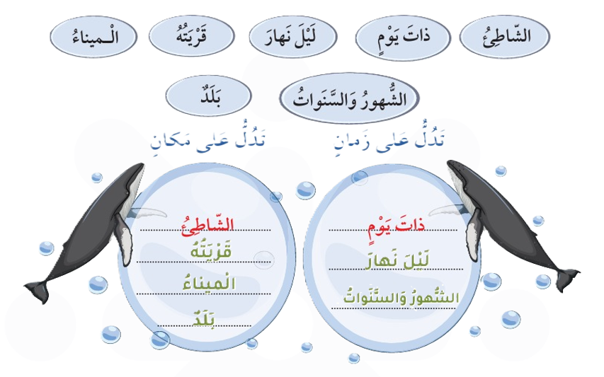 أُصَنِّفُ الكَلِمَاتِ وَالتَّرَاكِيبَ الْآتِيَةَ فِي الْجَدْوَلِ وِفْقَ دَلَالَتِهَا، كَمَا فِي الْمِثَالِ.