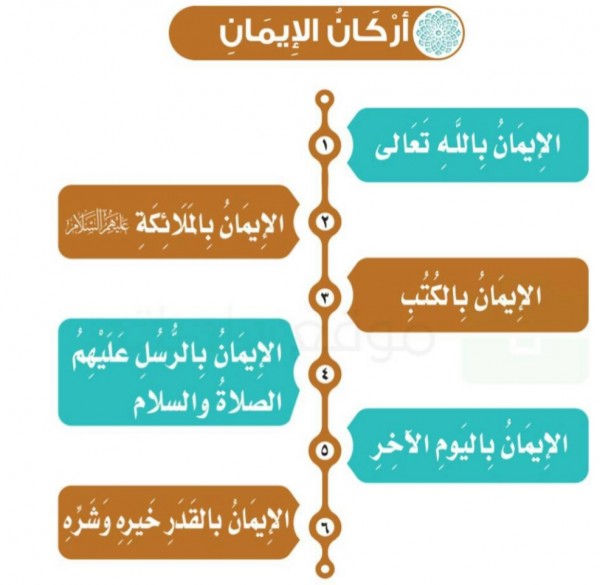 - للإيمان أركان ستّة يجب الإيمان بها، هي: الإيمان بالله تعالى، وملائكته، وكتبه، ورسله، واليوم الآخر ، والقدر خيره وشرّه.