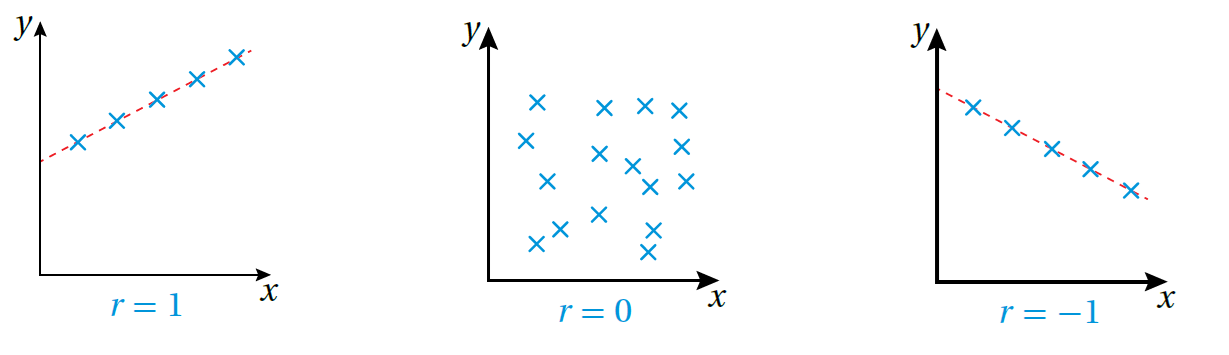 إذا كانت قيمة معامل ارتباط بيرسون r = 1 ، فإنَّ الارتباط التام الموجب يَحْكم العلاقة بين المُتغيِّرين؛ إذ تقع جميع نقاط شكل الانتشار على خطٍّ مستقيم ذي ميل موجب. أمّا إذا كانت قيمة معامل ارتباط بيرسون r = -1 ، فإنَّ العلاقة بين المُتغيِّرين يُمثِّلها الارتباط التام السالب؛ إذ تقع جميع النقاط على خطٍّ مستقيم ذي ميل سالب. وأمّا إذا كانت قيمة معامل ارتباط بيرسون r = 0 ، فإنَّ العلاقة بين المُتغيِّرين تكون معدومة؛ إذ تظهر نقاط شكل الانتشار مُتناثِرة بشكل عشوائي أو مُتجمِّعة على هيئة نمط دائري؛ ما يشير إلى غياب العلاقة الخطِّية بينهما.