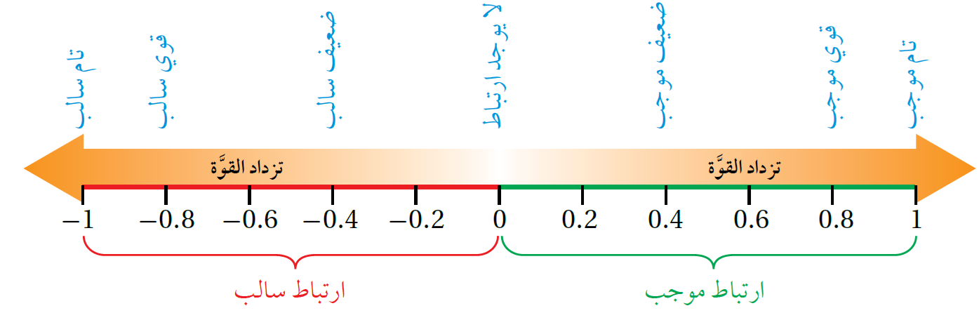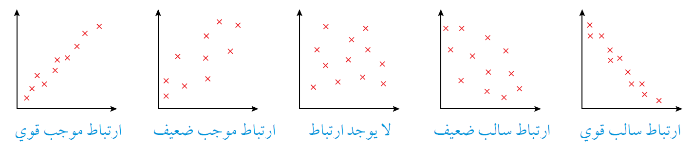 بعد ذلك، يتمُّ تحديد اتجاه هذه العلاقة، وتعرُّف إذا كان الارتباط بينهما موجبًا بما يعني أنَّ زيادة أحد المُتغيِّرين تؤدّي إلى زيادة الآخر بوجه عام، أو سالبًا؛ أيْ إنَّ زيادة أحد المُتغيِّرين تؤدّي إلى نقصان الآخر بوجه عام، وكذلك تعرُّف إذا كان الارتباط بينهما قويًّا، أو ضعيفًا، أو لا يوجد ارتباط بينهما كما هو مُبيَّن في أشكال الانتشار الآتية: