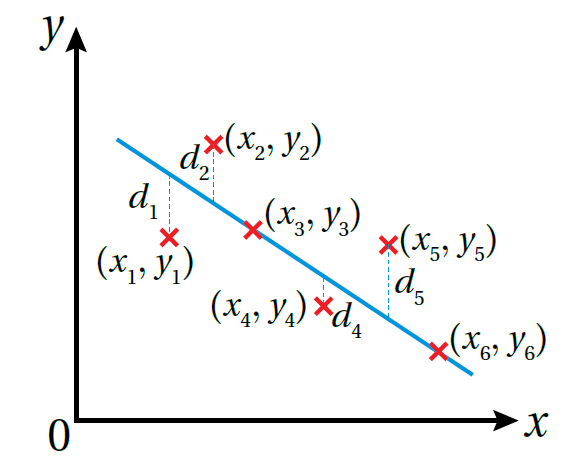 يُبيِّن الشكل المجاور شكل انتشار رُسِم عليه المستقيم d1, d2, d4, d5 الأفضل مطابقة، وفيه تُمثِّل المسافات: 5 الفروق بين القِيَم المُتنبَّأ بها للمُتغيِّر y من خلال المستقيم الأفضل مطابقة والقِيَم الفعلية للمُتغيِّر y من نقاط شكل الانتشار.
