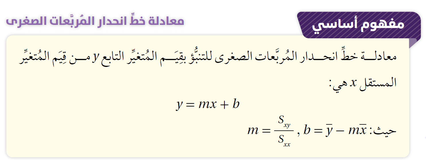 لتقليل هذه الفروق، يجب اختيار المستقيم الأفضل مطابقة الذي يجعل مجموع مُربَّعات هذه الفروق أصغر ما يُمكِن، والذي يُسمّى خطَّ انحدار المُربَّعات الصغرى، ويُمكِن إيجاد معادلته باستعمال الصيغة الآتية: