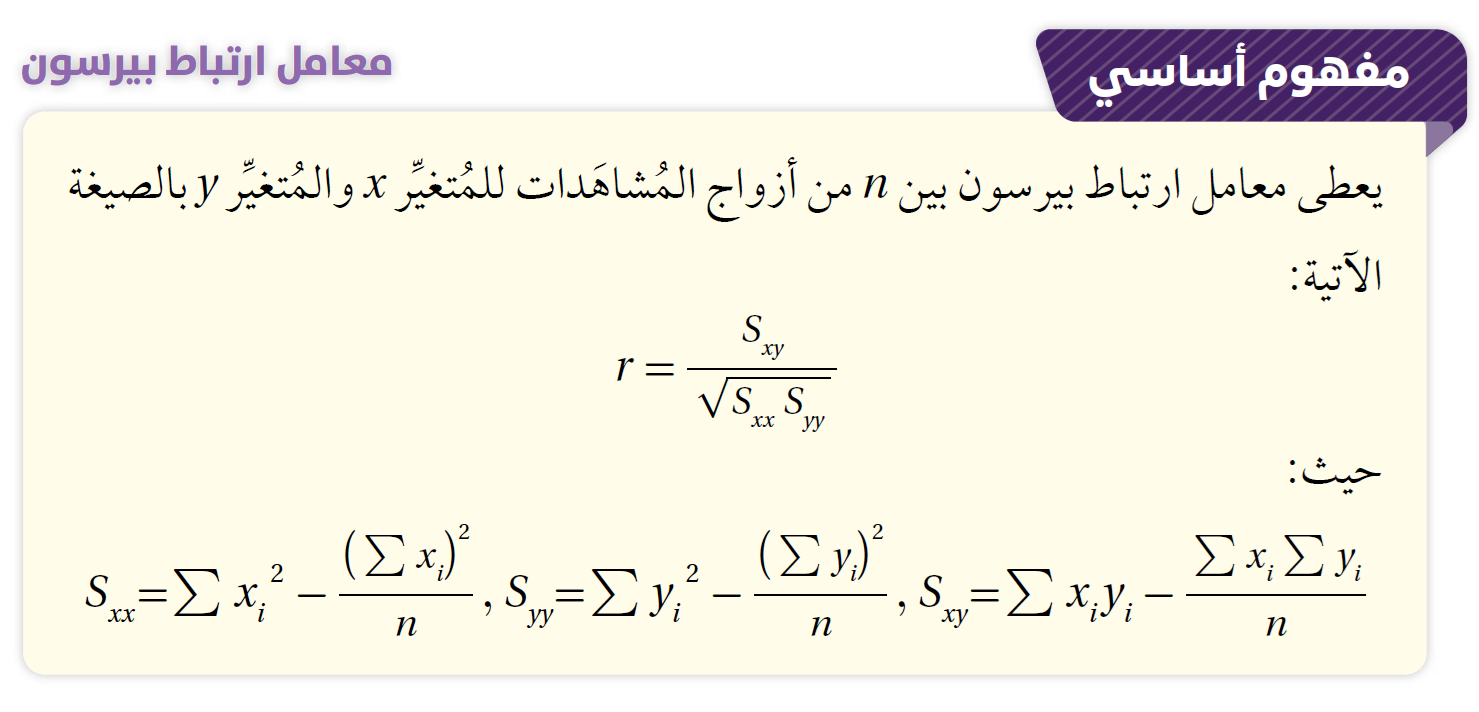 يُعَدُّ رسم شكل الانتشار وسيلة فعّالة للتحقُّق من وجود علاقة بين مجموعتين من البيانات، لكنَّ ذلك لا يُوفِّر دائمًا دلالة واضحة على طبيعة هذا الارتباط؛ لذا يُستعمَل معامل ارتباط بيرسون بوصفه مقياسًا عدديًّا يُحدِّد تحديدًا دقيقًا قوَّة العلاقة الخطِّية بين مجموعتين من البيانات، إضافةً إلى اتجاهها؛ سواء أكان موجبًا أم سالبًا.