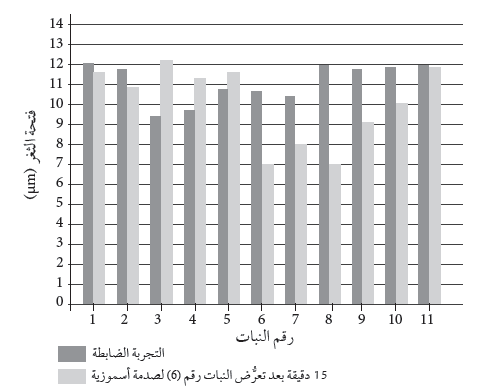 3 . أقترح: دوِّنت قراءات لفتحات الثغور بعد ساعة من بدء التجربة، ولوحظ أنَّ فتحات الثغور للنباتات (11-9) مشابِهة لتلك التي في النباتات (6- 8)، أقترح سببا لذلك.