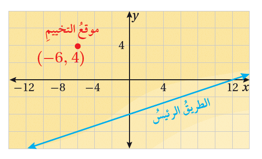لإيجادِ أقصرِ مسافةٍ بينَ موقعِ التخييمِ والطريقِ الرئيسِ، أَجِدُ البُعدَ بينَ النقطةِ (6,4-) والمستقم .