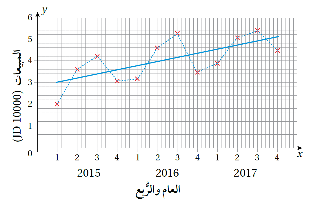 يُمثِّل الشكل الآتي منحنى السلسلة الزمنية للمبيعات الرُّبعية (بعشرات آلاف الدنانير) من أجهزة تكييف الهواء في محل أجهزة كهربائية على مدار 3 أعوام مُتتالِية، وخطَّ الاتجاه العام لهذه السلسلة.