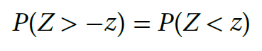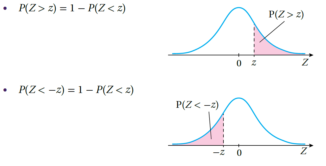 يُبيِّن الجدول السابق احتمال القِيَم التي تقلُّ عن (أو تساوي) القيمة المعيارية z، ويُمكِن أيضًا إيجاد احتمال القيمة التي تزيد على (أو تساوي) القيمة المعيارية (z-) من الجدول مباشرة؛ لأنَّ مساحة المنطقة أسفل منحنى التوزيع الطبيعي التي تقع يمين القيمة المعيارية ( z-) مُساوِية لمساحة المنطقة أسفل منحنى التوزيع الطبيعي التي تقع يسار القيمة المعيارية.
