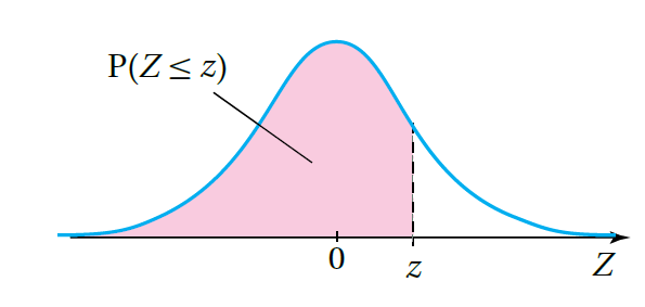 تُمثِّل مساحة المنطقة المُظلَّلة احتمال قِيَم المُتغيِّر العشوائي الطبيعي المعياري Z التي تقلُّ عن (أو تساوي) القيمة المعيارية z، أو