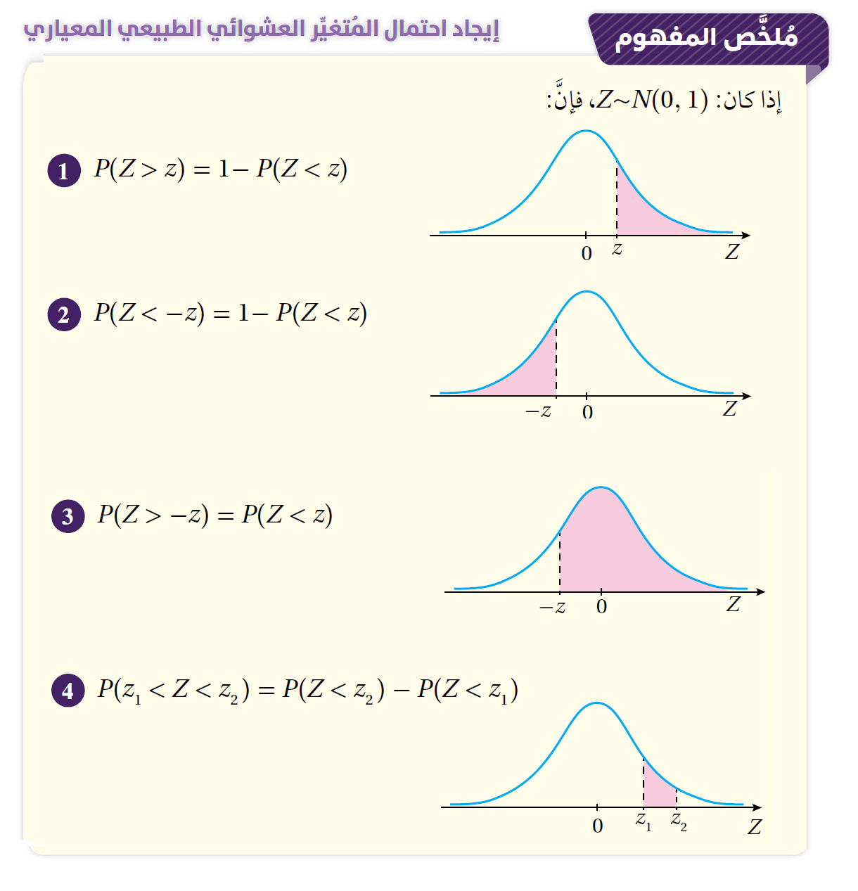 * تُعَدُّ القاعدتان صحيحتين؛ لأنَّ المساحة أسفل المنحنى الطبيعي المعياري كاملة هي 1، ولأنَّها تُمثِّل احتمال الحادث الأكيد.