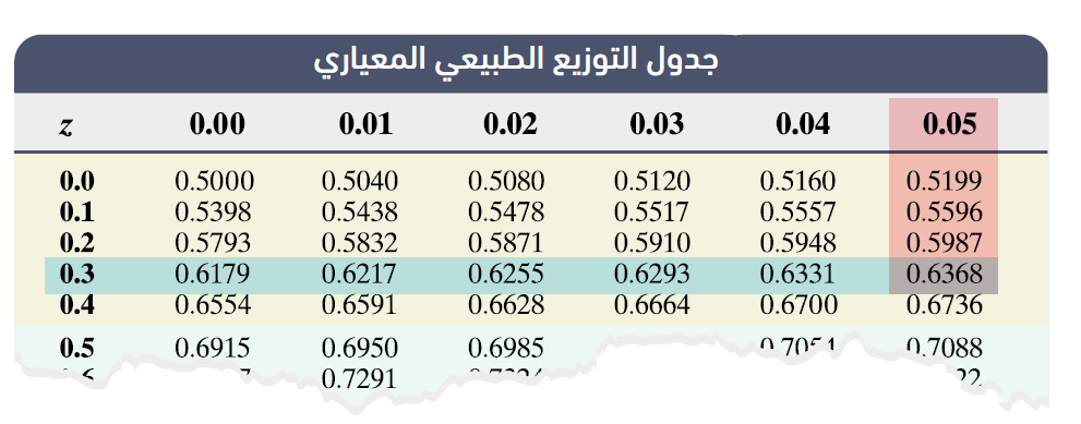 يُبيِّن الشكل التالي جزءًا من جدول التوزيع الطبيعي المعياري الذي يحتوي فيه العمود الأوَّل من جهة اليسار على منزلة أجزاء العشرة في قيمة z المعيارية، ويحتوي فيه الصف الأوَّل على منزلة أجزاء المئة في قيمة z المعيارية، وتُمثِّل القيمة المُقابِلة لكلٍّ من هاتين القيمتين في الجدول المساحة أسفل المنحنى الطبيعي المعياري التي تقع يسار قيمة z المعيارية، أو فمثلًًا، لإيجاد المساحة أسفل المنحنى الطبيعي المعياري التي تقع يسار z = 0.35 ، أجد القيمة المُقابِلة لكلٍّ من 0.3 في العمود الأوَّل، و 0.05 في الصف الأوَّل، وهذه القيمة تساوي