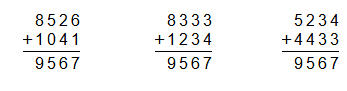 8) أُكَوِّنُ عَدَدَيْنِ كُلٌّ مِنْهُما مِنْ أَرْبَعِ مَنازِلَ وَ مَجْموعُهُما 9567 أَكْتُبُ ثَلاثَةَ حُلولٍ