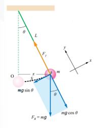 عند سحب الكرة كتلتها m معلقة بحبل طوله L نحو اليمين بحيث يمسح خط البندول زاوية وتقطع الكرة مسافة قوسية s عن موقع الاتزان .