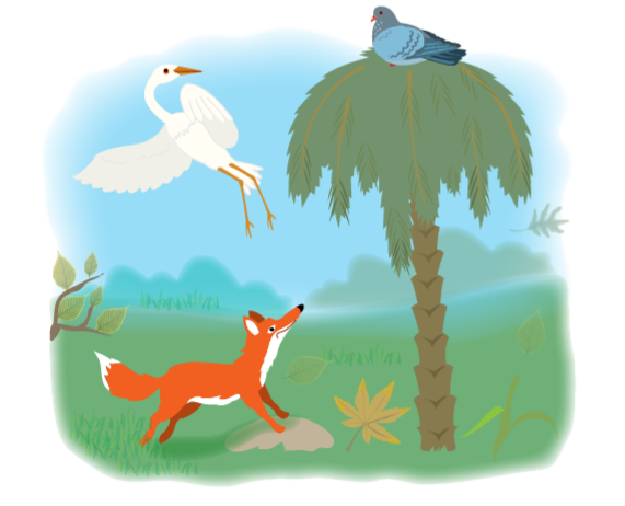 حمامةٌ حمقاءُ اسْتَغَلَّ الثَّعلَبُ بِدَهائِهِ المَعْهودِ سذاجَتَها، فَهَدَّدَها بِأنْ يَصْعَدَ إلَيْها إنْ هِيَ لَمْ تُلْقِ بِفِراخِها إليه.