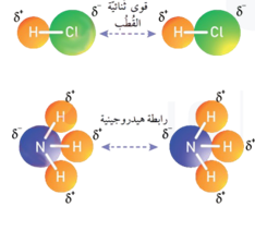 - تنشأ عندما ترتبط ذرة تحمل شحنة جزئية موجبة(𝛿⁺) في جزيء بذرة تحمل شحنة جزئية سالبة (𝛿⁻) من جزيء آخر.