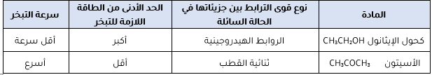 - يبين الجدول التالي نوع قوى التجاذب بين جزيئات سائلين؛ كحول الإيثانول والأسيتون, ومقارنة بين سرعة تبخرهما.