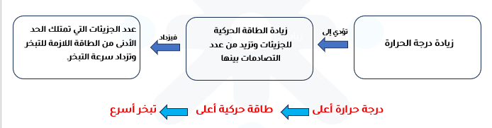 زيادة درجة الحرارة تزيد من الطاقة الحركية للجزيئات وتزيد من عدد التصادمات بينها، فيزداد عدد الجزيئات التي تمتلك الحد الأدنى من الطاقة اللازمة للتبخر وتزداد سرعة التبخر.
