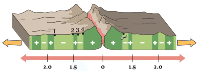 2. يوضح الشكل الآتي تتابعات الأشرطة المغناطيسية عند مركز التوسع أدرسه جيدا، ثم أحدد أي الصخور (1, 2, 3, 4) التي لها العمر المماثل لتلك التي تقع عند النقطة (ص):