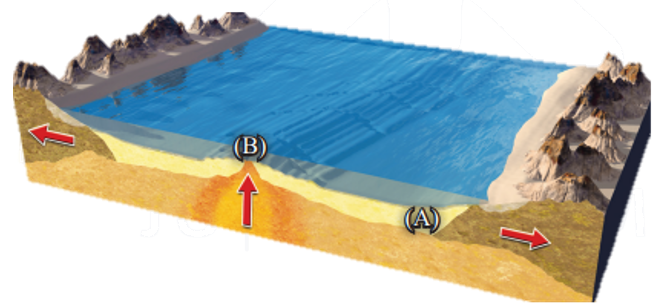 (4) أقارن: إذا حصلت على عينتين من صخور أحد قيعان المحيطات في الموقعين (A) و (B) كما في الشكل الآتي، فأيهما الأحدث عمرًا؟ لماذا ؟