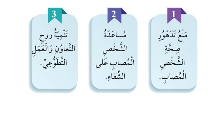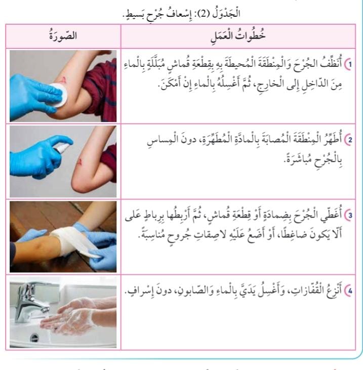 1- أَتَعاوَنُ مَعَ زَميلي/ زَميلَتي عَلى تَوْزيعِ الْأَدْوارِ (الْمُصابِ وَالْمُسْعِفِ).