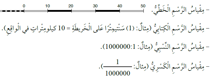 - مِقْياسُ الرَّسْمِ: هُوَ النِّسْبَةُ ما بَيْنَ قِياساتِ الرَّسْمِ عَلى الْخَريطَةِ وَالْقِياساتِ عَلى أَرْضِ الْواقِعِ، إِذْ يَصْعُبُ رَسْمُ الْأَبْعادِ الْحَقيقِيَّةِ لِأَرْضٍ عَلى الْوَرَقِ؛ لِذا تُصَغَّرُ هذِهِ الْأَبْعادُ بِاسْتِعْمالِ مِقْياسِ الرَّسْمِ.