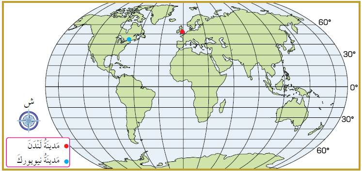- أُحَدِدُ قيمَةَ خَطَّيِ الطّولِ لِلْمَدينَتَيْنِ: خَطُّ الطّولِ لِمَدينَةِ لَنْدَنَ غرينتش 0 دَرَجَةً، وَخَطُّ الطّولِ لِمَدينَةِ نيويوركَ 75 دَرَجَةً.