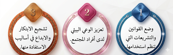• الأستثمار الأمثل للموارد الطبيعية:استخدام الموارد الموجودة في الطبيعة لتحقيق أقصى فائدة منها دون إحداث أي ضرر بها والحفاظ عليها للأجيال القادمة