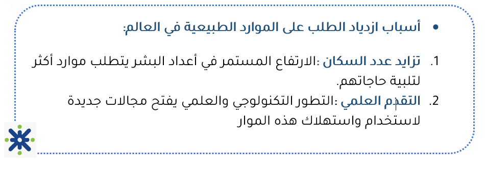 الموارد الطبيعية: هي كل ما يوجد في البيئة دون تدخل الإنسان وتستخدم لتلبية احتياجاته اليومية ومع تزايد عدد السكان والتقدم العلمي، ارتفع الطلب على هذه الموارد،مما أدى في بعض الحالات إلى استغلالها بشكل مفرط، وجعل بعضها عرضة للنفاذ