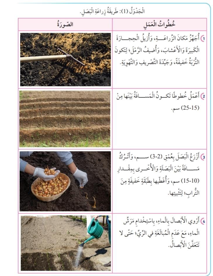 أَزْرَعُ الْبَصَلَ بِعُمْقِ (2-3) سم، وَأَتْرُكُ مَسافَةً بَيْنَ الْبَصَلَةِ وَالْأُخْرى بِمِقْدارِ (10-15) سم، وَأُغَطّيها بِطَبَقَةٍ خَفيفَةٍ مِنَ التُّرابِ