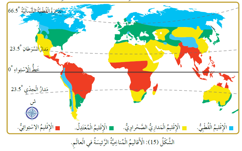 أَنْظُرُ الْخَريطَةَ الْآتِيَةَ، وَأَتَعَرَفُ تَوْزيعَ الْأَقَاليمِ الْمُناخِيَةِ الرَئيسَةِ في الْعالَمِ، ثُمَ أُجيبُ عَمّا يَليها: