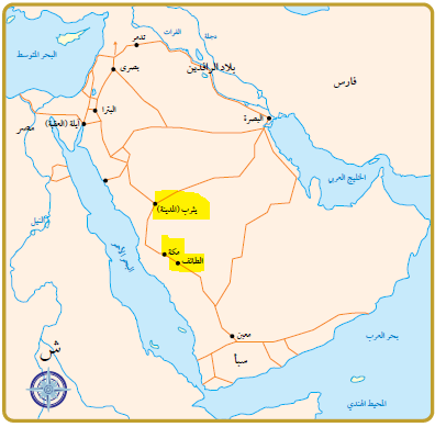 أُحَدِدُ عَلى الْخَريطَةِ الْمُدُنَ: مَكَّةَ، وَيَثْرِبَ )الْمَدينَةَ الْمُنَوَرَةَ(، وَالطّائِفَ.