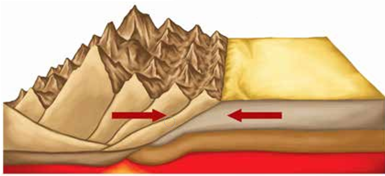 ج. صفيحتان قارّيتان: تصطدمان فتتشكل طيّات وسلاسل جبلية ضخمة. (مثال: جبال الهيمالايا). -