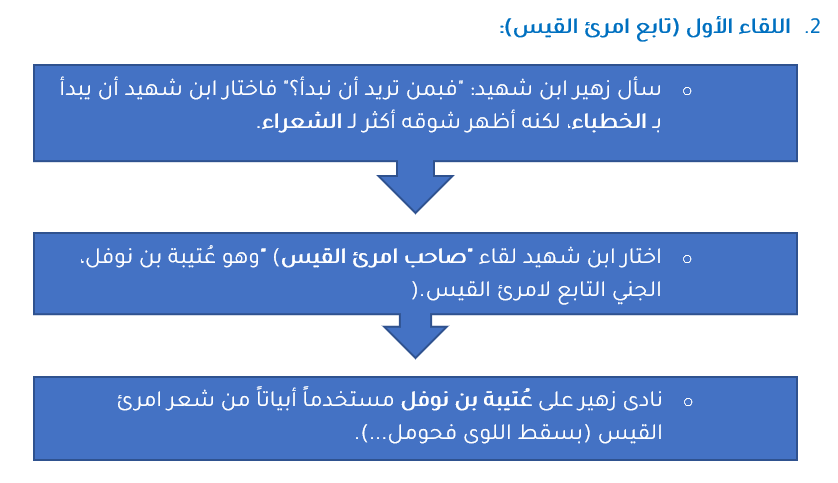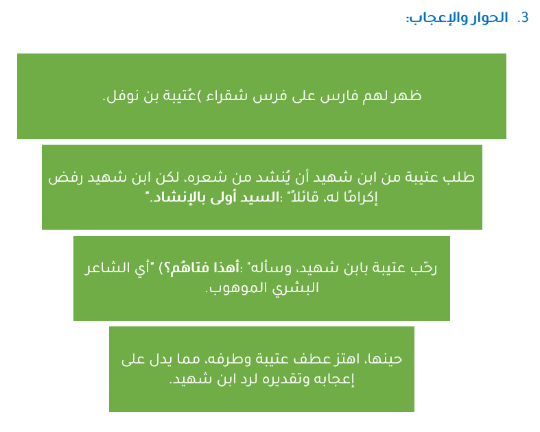 فقال لي: أنشد؛ فقلتُ: السيدُ أولى بالإنشاد. فتطامح طرفُه، واهتزَّ عطفه، وقبض عنانَ الشقراء."