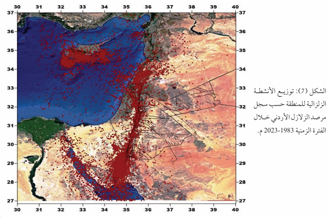 الأردن وشرقه هما أقل المناطق نشاطا، أنظر الشكل (7) الذي يين نوزع الأنشطة الزلزالية للمنطقة (حسب سجل مرصد الزلازل الأردني خلال الفترة الزمنية 2023-1983، فقد رصدت أكثر من 13000 هزة تراوحت مقاديرها
